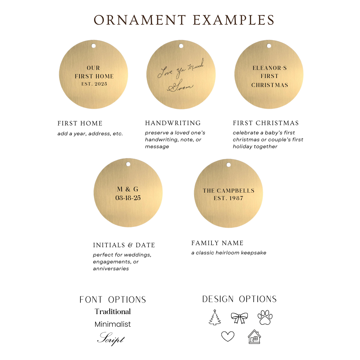 A timeless keepsake, made personal. Each ornament is crafted from solid brass and finished with a soft ivory ribbon for an heirloom feel. Customize yours with a meaningful engraving to be treasured year after year— from a family name or first home address to a memorable date.